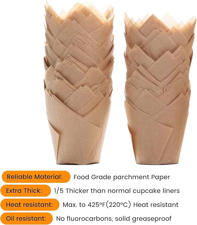 - Heat-resistant Thicker Paper: Bake Choice tulip cupcake liners are made from 50-55gram/m2 greaseproof paper, which is 1/5 thicker than normal parchment paper. Therefore, these cupcake liners is consistently greaseproof and can handle the temperature up to 220°C/428°F without the addition of fluorocarbons.
